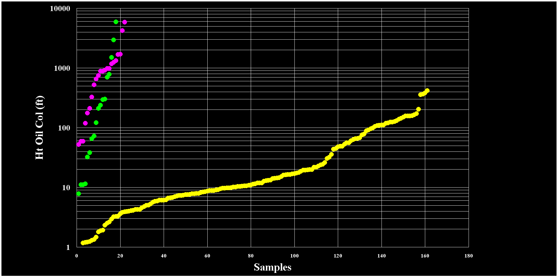 | SEAL CAPACITY The following figure is a compilation of displacement pressures for shales (purple), sandstones (yellow), and carbonates (green). All data were derived from mercury capillary tests. The trapping capacity of different potential seals ranges from 0-10 ft of oil for good reservoir sands to as high as 8000 ft for good shales and tight carbonates. Column heights were calculated using a 35 API oil at near surface conditions with a density of 0.85 g/cm3, an interfacial tension of 21 dynes/cm and a brine density of 1.05 g/cm3. A good shale can trap more hydrocarbons than are available to charge a trap. Poor shales, from fluvial environments or highstand systems tracts, for example, are the real risk. Capillary properties affect both fault seals and top seals. | |